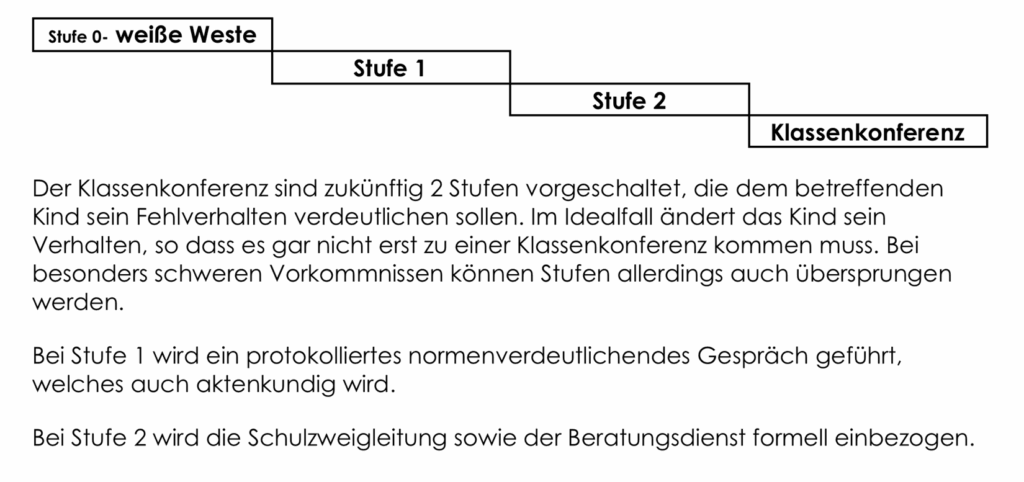 Eine Klassenkonferenz kann einberufen werden, um weiterführende pädagogische Maßnahmen zu beraten, die im Einvernehmen mit allen unterrichtenden Lehrerinnen und Lehrern und auch den Eltern der betroffenen Schülerinnen und Schülern getroffen werden sollen. Sie muss einberufen werden, wenn Ordnungsmaßnahmen angedroht oder beschlossen werden sollen.